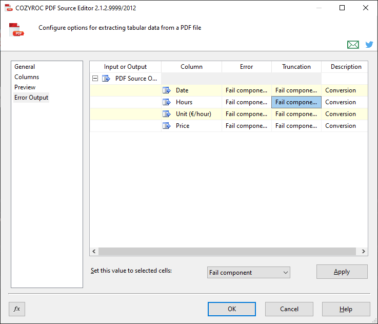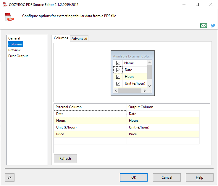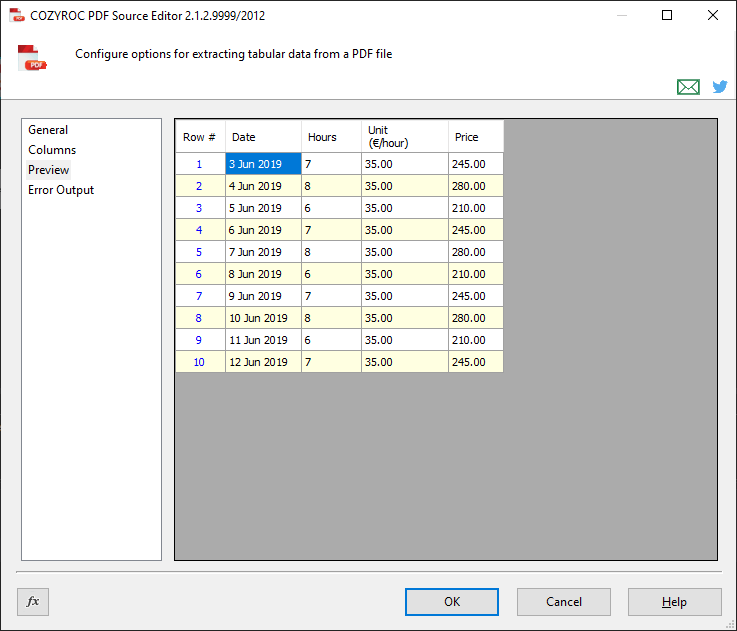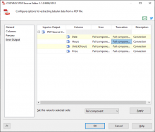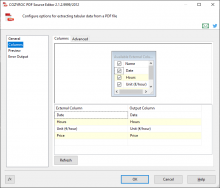 The PDF Source Component is an SSIS Data Flow Component for consuming tabular data from PDF files. The component detects tables in the PDF file and allows processing a single table or multiple consecutive tables (across several pages), assuming they have the same structure. All output columns are of data type DT_WSTR.
