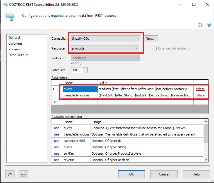 Step 2. Double click on the "REST Source" component and select a Shopify GraphQL connection from the combo. Select from the available Shopify GraphQL resources listed in the second combo below.