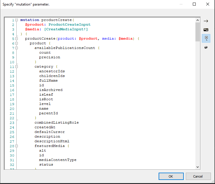 - variables - a template of the variables element that will contain the actual mutation data, the structure corresponds to the variable definitions and parameterization of the mutation above