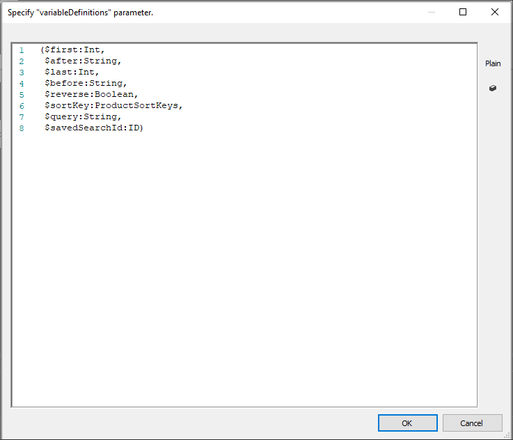 - variableDefinitions: Format should be a valid GraphQL variable definition e.g. ($first:Int, $after:String). Optional.